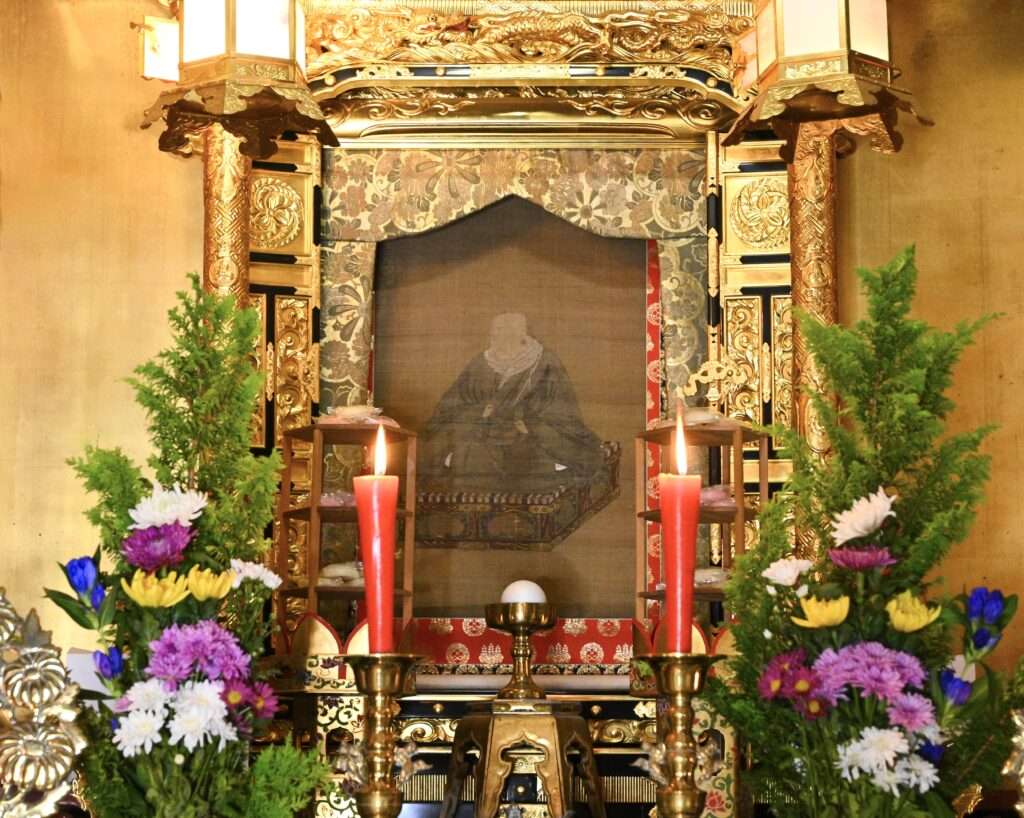 中央には御本尊である阿弥陀さま 向かって右側には宗祖 親鸞聖人 左側には 蓮如上人をご安置しています。